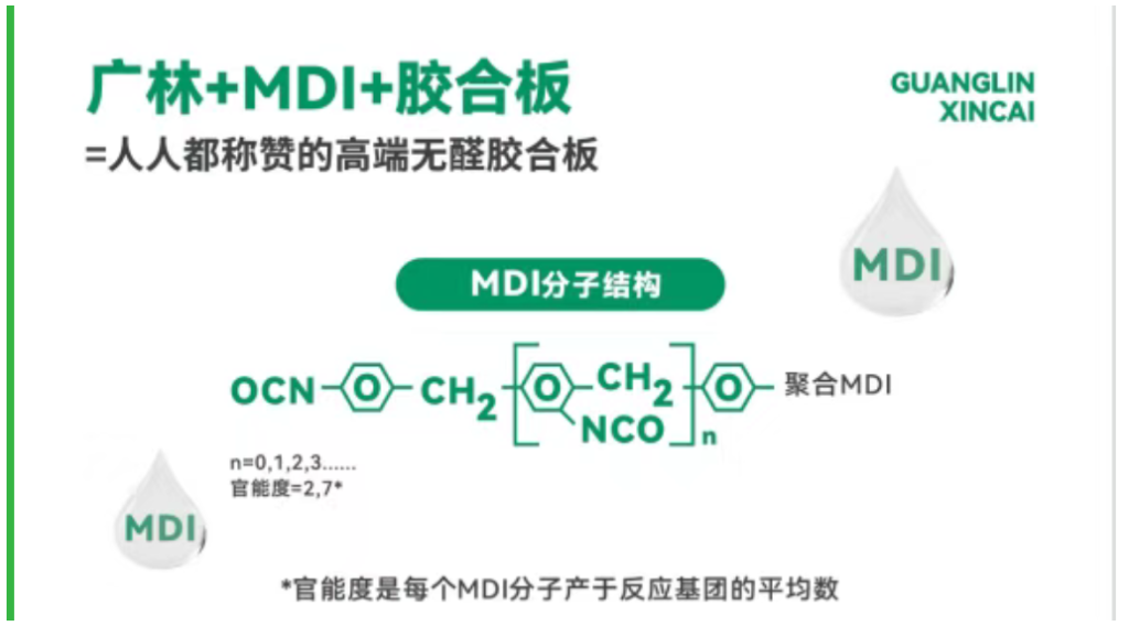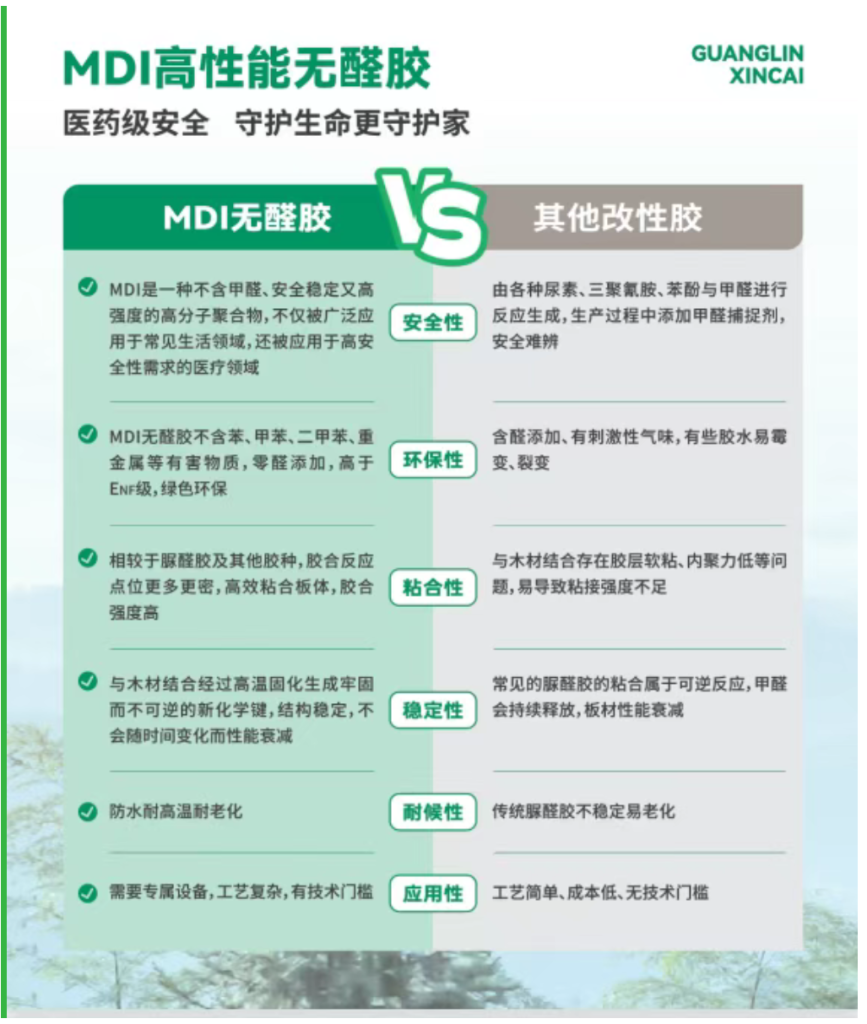 傳統(tǒng)板材的甲醛問(wèn)題多源于脲醛膠,而廣林精板MDI海洋板采用的MDI無(wú)醛生態(tài)膠,徹底顛覆了這一痛點(diǎn)。